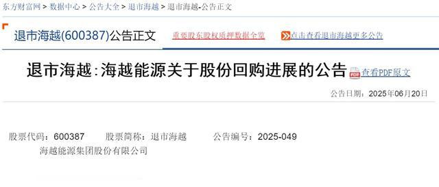 股票索赔平台微信公众号“公义之星”讯,2025年6月20日,退市海越(海越能源600387)公告披露:截至6月19日,公司通过集中竞价交易方式已累计回购股份200.07万股。购买的最高价为每股0.86元、最低价为每股0.83元,已支付的总金额168.15万元。